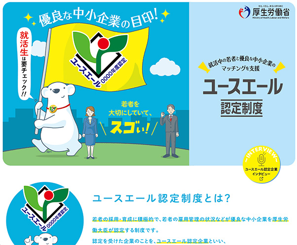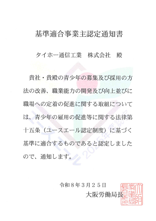若者の採用・育成と働きやすい職場づくりが評価され、「ユースエール認定企業」に選ばれました。